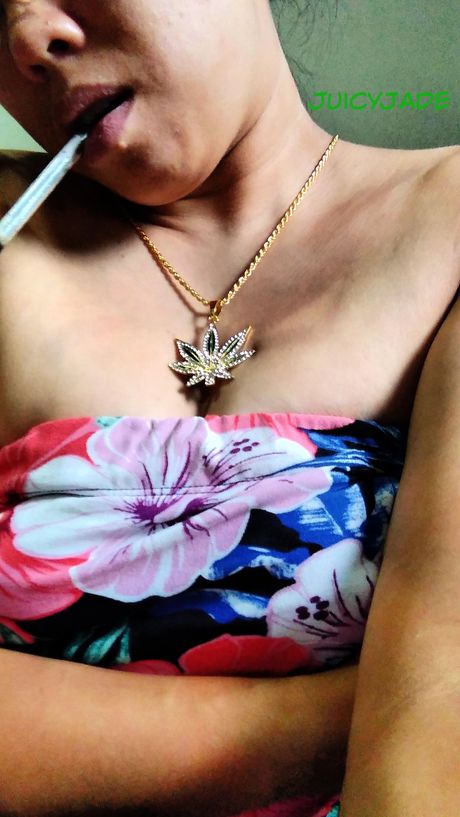juicyjade: Asian amateur girl with glasses strips and shows her hairy pussy up close