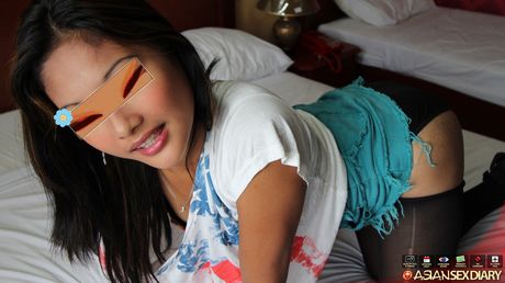 Asian Sex Diary: Asian teen Ella strips to her stockings and rubs wet twat on the bed