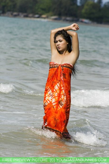 Hot Bunny Promotion: Asian teen Kayla strips and shows her tiny tits and pink pussy on the beach