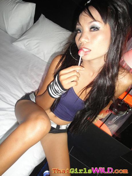 Thai Girls Wild: Hot Thai slut named Well sucks a lolipop then strips for pictures