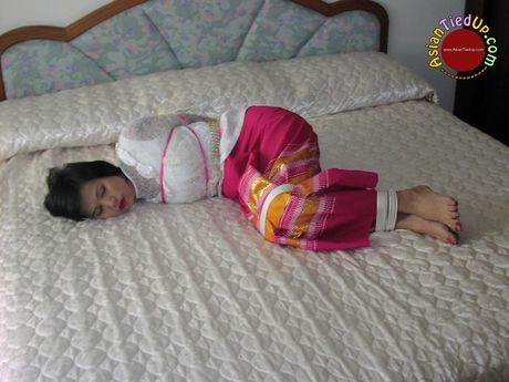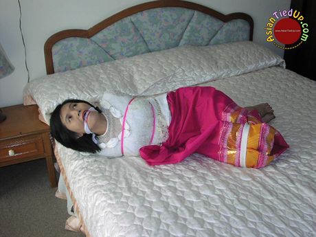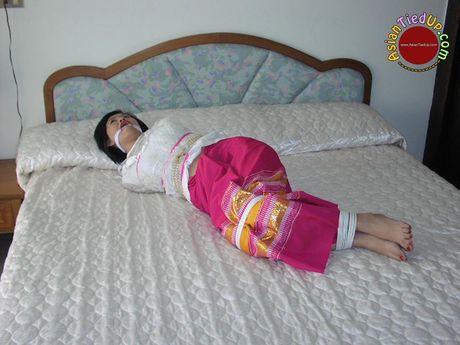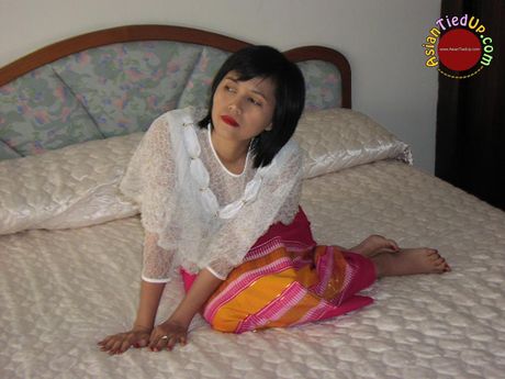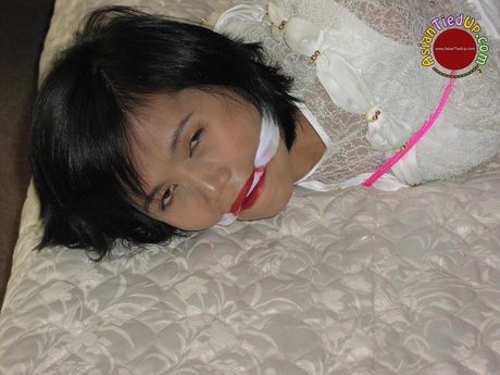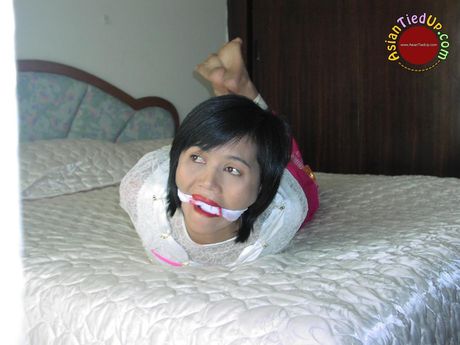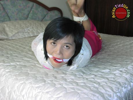 Asian Tied Up: Japanese lady strips off and bares her tiny tits and pussy