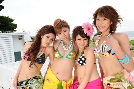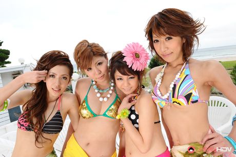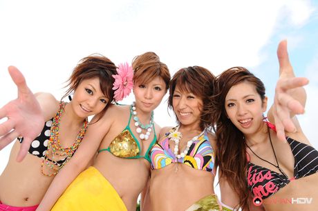 Japan HDV: Lusty hot girls pose in group in their bikinis and have fun on the set