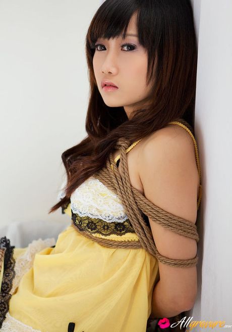 All Gravure: Miko Asian doll in fishnets has hands and boobies tied with ropes