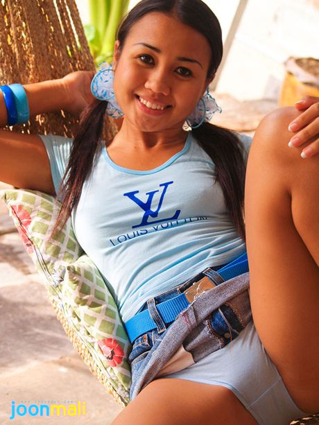 Joon Mali: Round face Joon Mali in a tight top and short denim skirt
