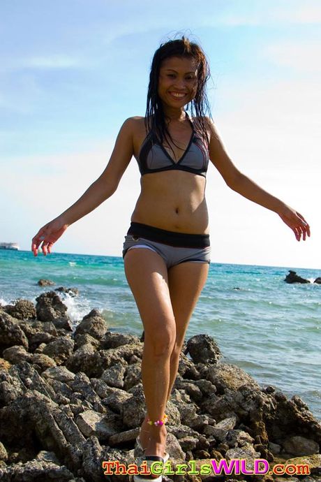 Thai Girls Wild: Sexy petite Thai babes strip out of bikinis on the beach
