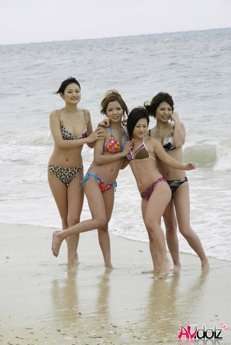 AV Idolz: Stunning Japanese babes in bikinis strip and play with each others cunts poolside