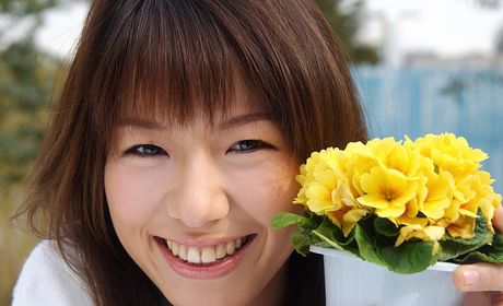 Idols 69: Towa Aino schoolgitl model shows off big boob cleavage in an open shirt